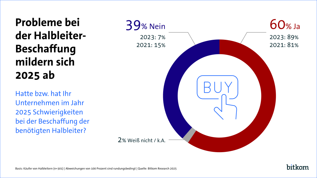 So fordern 90 Prozent der befragten Unternehmen, Deutschland müsse einseitige Abhängigkeiten bei der Halbleiterversorgung beenden. 86 Prozent halten ein starkes Halbleiter-Ökosystem wichtig für die nationale Sicherheit und 85 Prozent für entscheidend, wenn es um die digitale Souveränität Deutschlands geht. Den Status-quo der Halbleiter-Versorgung erleben die Unternehmen weiterhin als schwierig, wenn auch weniger problematisch als 2023 und 2021. So hatten 60 Prozent derjenigen, die in diesem Jahr bereits Halbleiter gekauft haben, Schwierigkeiten bei der Beschaffung – 2023 sagten dies noch 89 Prozent und 81 Prozent im Jahr 2021.