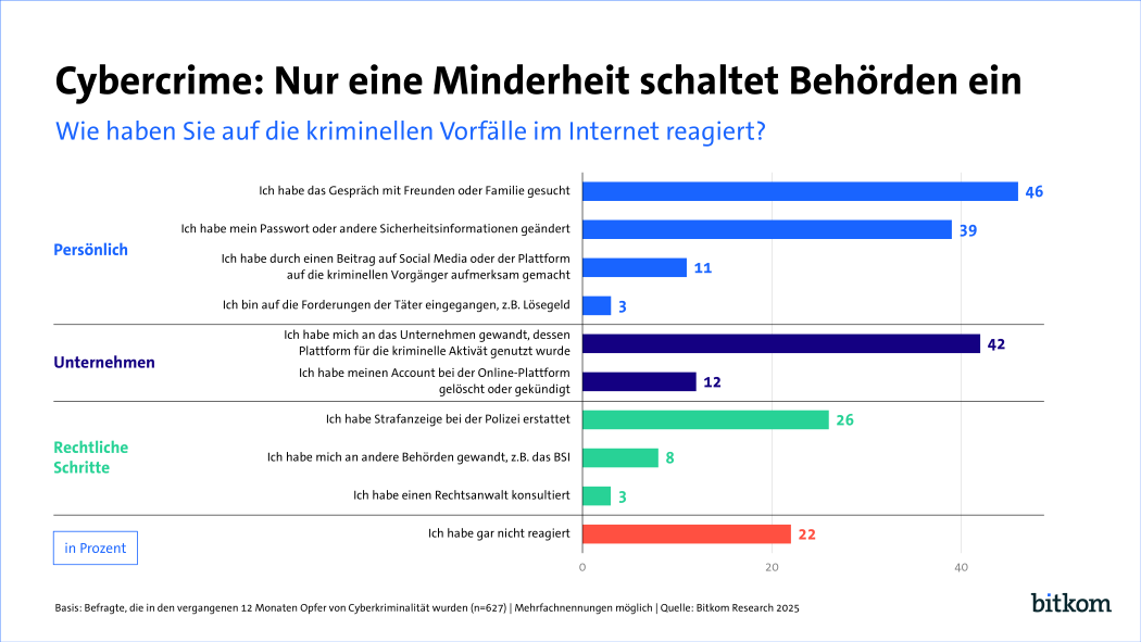 Nur rund ein Viertel (26 Prozent) der von Cyberkriminalität Betroffenen haben Strafanzeige bei der Polizei erstattet. 8 Prozent haben sich an andere Behörden gewandt wie etwa das Bundesamt für Sicherheit in der Informationstechnik (BSI) und 3 Prozent haben einen Rechtsanwalt aufgesucht. „Bei Cyberkriminalität haben wir in den offiziellen Statistiken eine hohe Dunkelziffer, weil viele Menschen sich nicht an Behörden wenden oder juristische Schritte ergreifen“, so Wintergerst. Häufiger suchen Betroffene Hilfe im persönlichen Umfeld oder ändern persönliche Verhaltensweisen. Fast die Hälfte (46 Prozent) hat das Gespräch mit Freunden oder Familie gesucht, 39 Prozent haben Passwörter oder andere Sicherheitsinformationen geändert, 11 Prozent haben durch Social-Media-Posts oder Beiträge auf Online-Plattformen auf die kriminellen Vorgänge aufmerksam gemacht und 3 Prozent sind auf Forderungen der Kriminellen wie etwa Lösegeldzahlungen eingegangen. Zudem haben sich 42 Prozent an das Unternehmen gewandt, dessen Plattform für die kriminellen Aktivitäten genutzt wurde, und 12 Prozent haben ihren Account dort gelöscht oder gekündigt. Rund ein Fünftel (22 Prozent) hat aber überhaupt nicht reagiert.