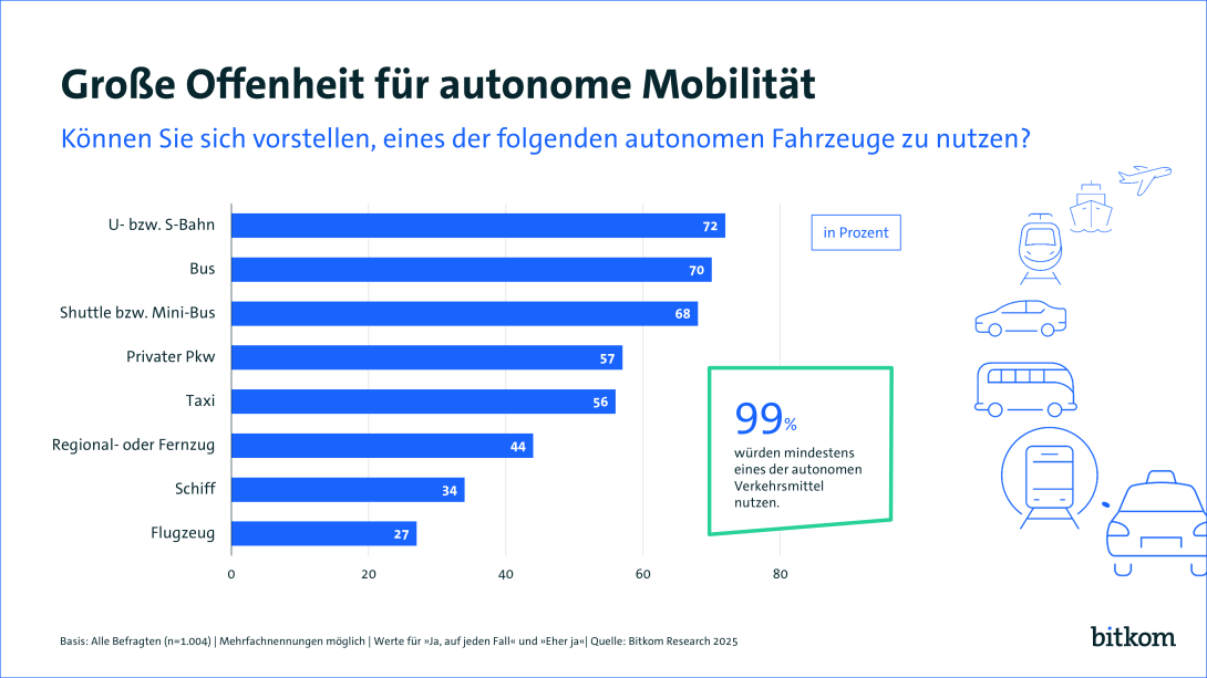 Demnach würden 72 Prozent der Deutschen eine autonome U- oder S-Bahn nutzen. In einen autonomen Bus würden 70 Prozent einsteigen, in einen autonomen Mini- oder Shuttle-Bus 68 Prozent. Auch einen autonomen Privat-Pkw würden 57 Prozent nutzen. Ein autonomes Taxi würden 56 Prozent nutzen, einen autonomen Regional- oder Fernzug 44 Prozent. Rund ein Drittel (34 Prozent) würde auf ein autonomes Schiff gehen und rund ein Viertel (27 Prozent) würde in ein autonomes Flugzeug steigen.