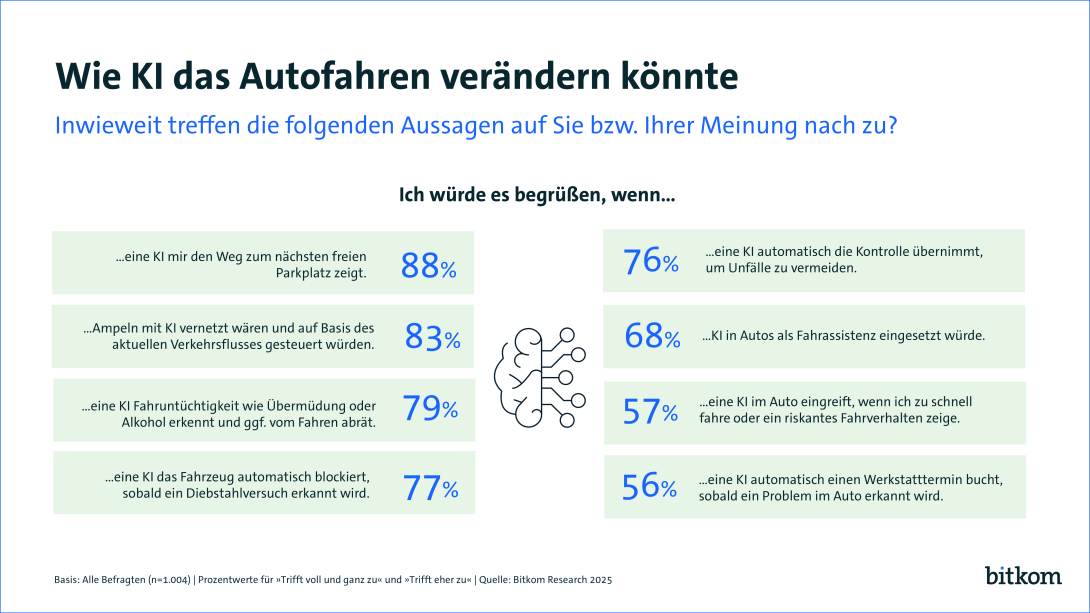 76 Prozent wollen eine KI, die im Ernstfall automatisch die Kontrolle übernimmt, um Unfälle zu vermeiden, 68 Prozent sind offen für KI als Fahrassistenz. 57 Prozent würden sich sogar wünschen, eine KI würde bei zu schnellem oder riskantem Fahren eingreifen. 56 Prozent fänden es gut, würde das Auto bei einem Problem automatisch einen Werkstatttermin buchen. „Künstliche Intelligenz kann Autofahren sicherer, komfortabler und ressourcenschonender machen“, so Wintergerst.